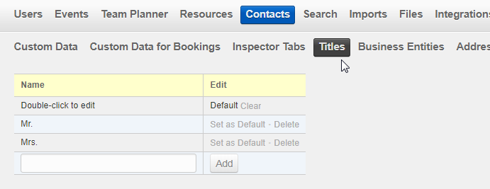 Create new titles by entering a name in the field at the bottom of the list and clicking “Add”. You can edit the name by double-clicking it. You can delete a title, but then it will be deleted everywhere. In other words, contacts that used this title won’t have a title anymore.
