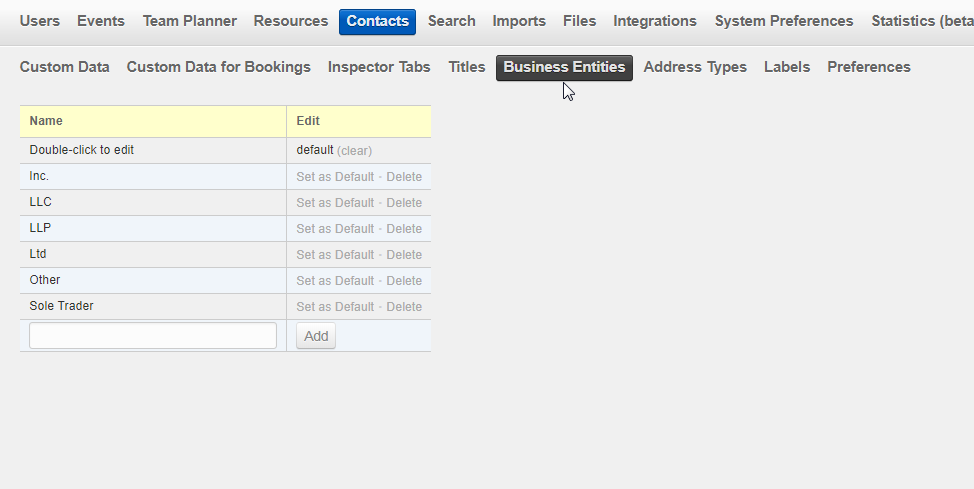 Create new business entities by entering a name in the field at the bottom of the list and clicking “Add”. You can edit the name by double-clicking it. You can delete a business entity, but then it will be deleted everywhere. In other words, contacts that used this business entity won’t have a business entity anymore.