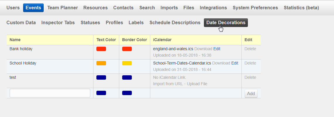 This screen displays an alphabetically ordered list of date decorations that are set in Yesplan. Create a new date decoration by filling out the fields in the last row of the table and clicking “Add”.