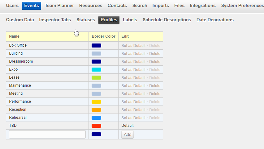 This screen displays an alphabetically ordered list of profiles that are used in Yesplan. Create a new profile by filling out the fields in the last row of the table and clicking “Add”.