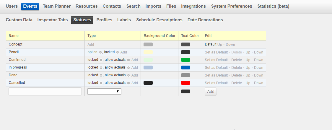 This screen displays a list of statuses that are used in Yesplan. Create a new status by filling out the fields in the last row of the table and clicking “Add”.