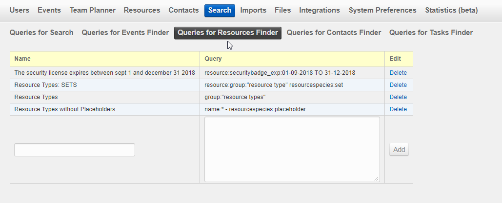 You can create a list of predefined queries per finder (search in the navigation menu or the events, resources, contacts or tasks finder).