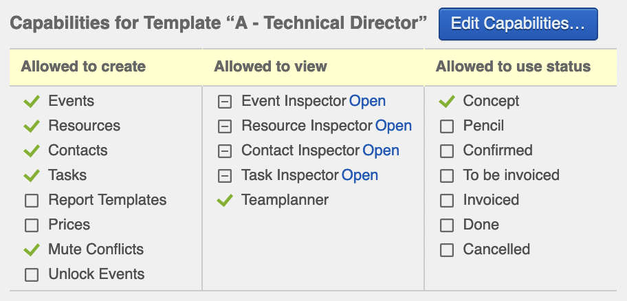 - These permissions appear in templates (in the column for resources) and in the tab “Permissions” of the inspector for resource bookings. They determine whether the user (or user group) in question can edit or delete a resource booking.