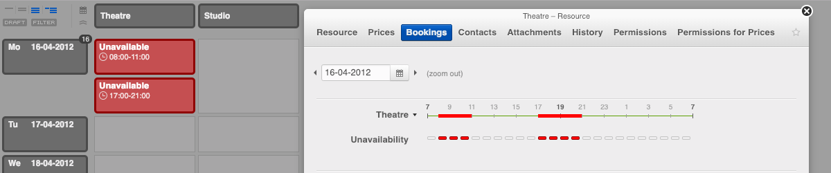 It’s possible to indicate that a resource or location is unavailable during certain periods via the event calendar, the Teamplanner or the resource inspector. Unavailabilities don’t have separate permissions in Yesplan, but they follow the permissions of that resource. In other words, if a user can book a certain resource, then this user can also mark the resource as unavailable and delete unavailabilities.