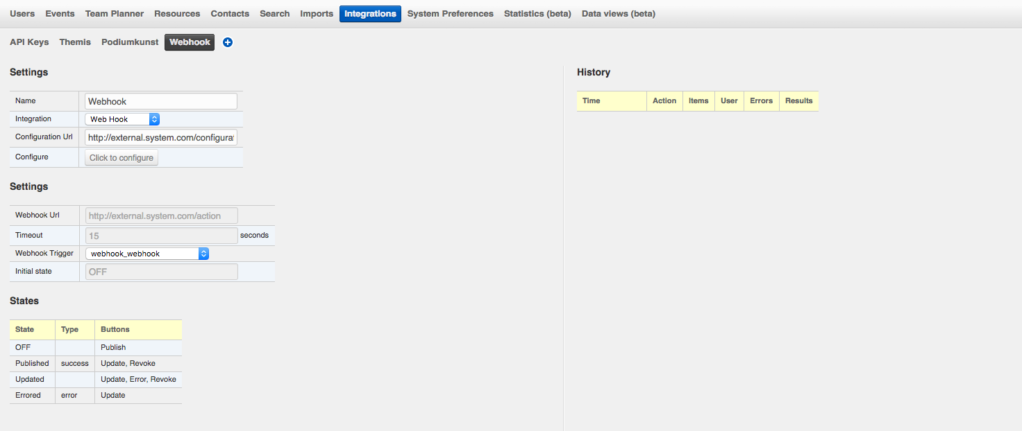 Yesplan offers customers and third parties the possibility to integrate with the system using webhooks. The integration allows a user to take an action in another system from within Yesplan. Yesplan sends the action to the other system. The other system can then retrieve, and write, data through the Yesplan HTTP API. A wide range of workflows that use Yesplan and other systems can be implemented using webhooks and the HTTP API, such as announcing a Yesplan event on a public website, making tickets for it available in a ticketing system, invoicing the event in financial software and so on. Webhooks allow all of these workflows to be initiated from within Yesplan while being handled by the other system.