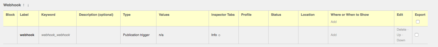 One other thing to set up is the integration custom data field. Setting up custom data fields is discussed in more detail in the chapter on “System Settings”. The custom data field needs to be of type “Publication trigger”. For this example, as shown on the screenshot below, the custom data field has label “webhook” and is made visible on the “Info” tab in event inspectors. In the settings for the integration, it is the field selected in the dropdown for the setting “Webhook Trigger”.