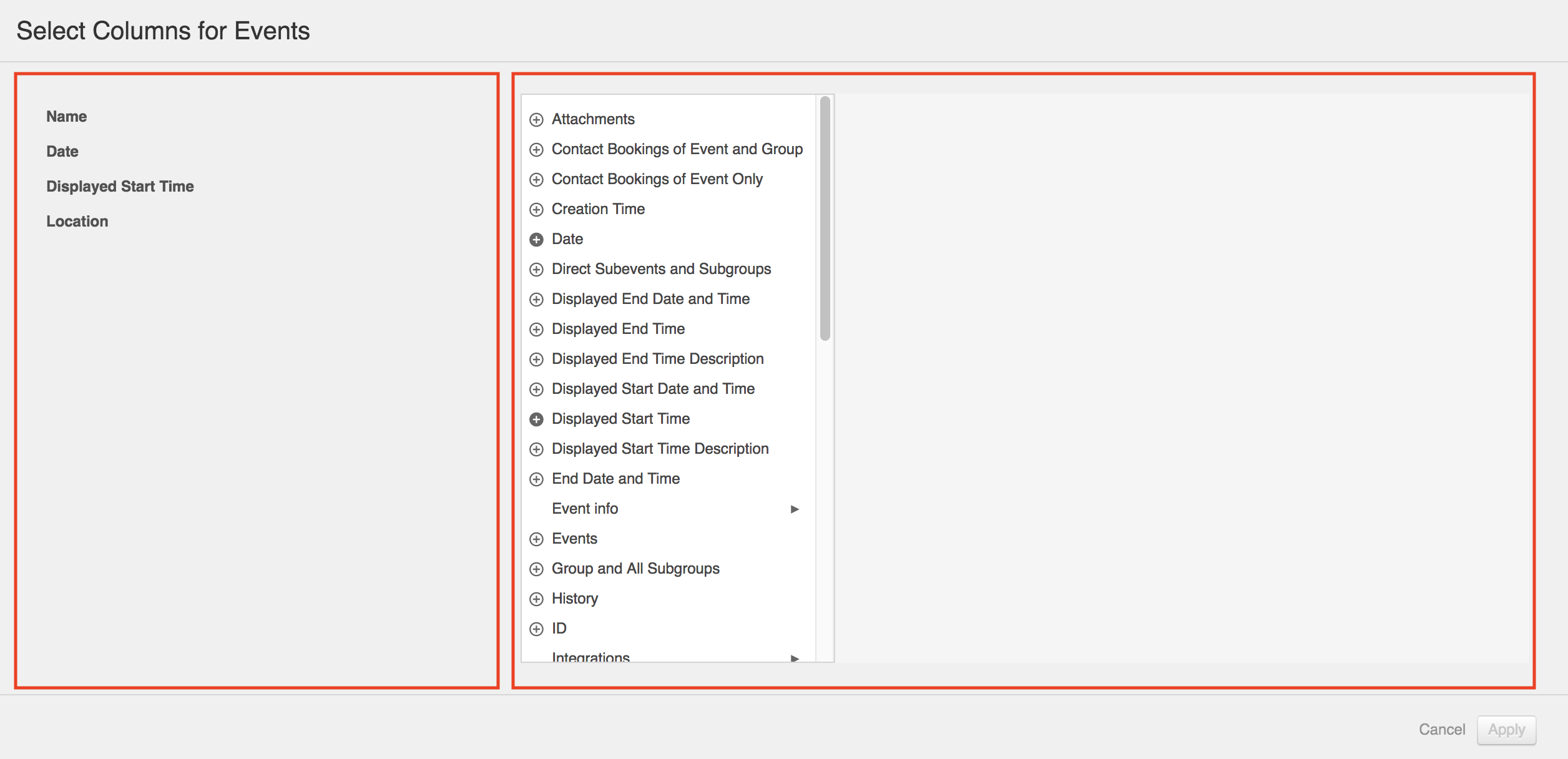 The left side of the selection window contains a list of fields that already appear in the dataview. The list shows the name of the field and its location in Yesplan’s structure. For instance, in the scope of events: