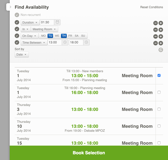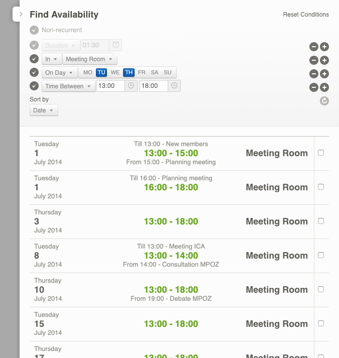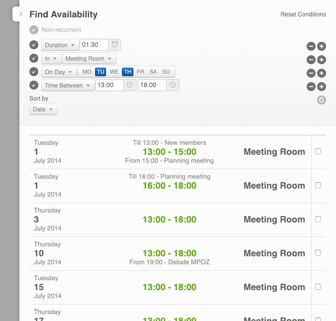 You can see the available times under the query. In the example, the first available moment is on Tuesday, 1 July from 13:00 to 15:00. The second option in the list indicates that you can also book the event between 16:00 and 18:00. These two options also indicate that the Meeting Room isn’t available between 15:00 and 16:00 because an event entitled ‘Planning Meeting’ is already scheduled. The third option in the list indicates that the Meeting Room is available on the following Thursday between 13:00 and 18:00, the fourth option that you can schedule on Thursday, 10 July between 13:00 and 18:00 etc.