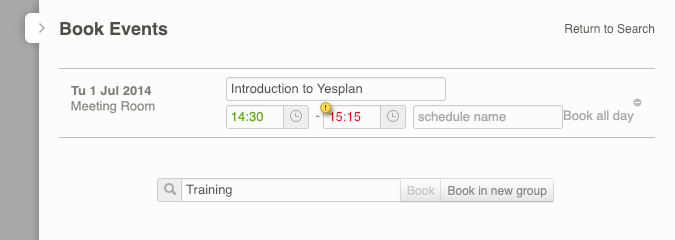 In this second step, the booking, you’re also warned if times are entered that exceed the availability. In Figure 5, a later time of day was filled out, making the event run from 14:30 to 15:15. The end time now has an exclamation mark, which indicates a conflict. After all, the end time is after 15:00, which is the start time of the event ‘Planning Meeting’ that takes place at that moment in the Meeting Room.