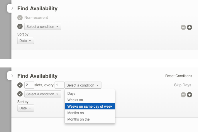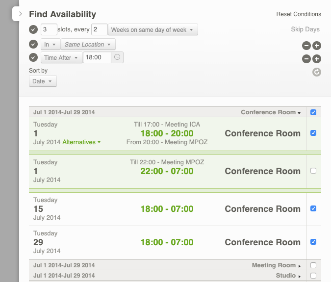 The available times appear a bit differently than for a non-recurrent query. More specifically, you see the possible available moments for the entire series together in a group, separated by a gray bar. Each group matches the query and you can book it as a series.