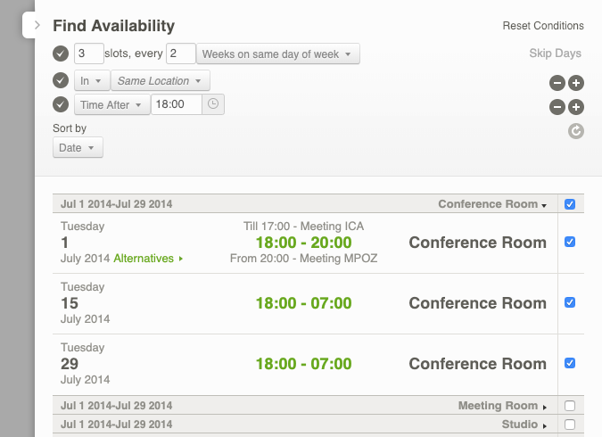 We enter the repeat—three events every two weeks on the same day—at the top by clicking the check mark to the left of the words “Non-recurrent”. We enter the number of desired time slots (3 slots), we select the condition “Weeks on same day of week” from the drop-down menu and we change the default 1 to 2 (every two weeks on the same day) (see Figure 6). Then we compose the rest of the query by adding conditions for the location (in the same location) and for the time slot that we want (evening, after 18:00). You see the result in Figure 7.