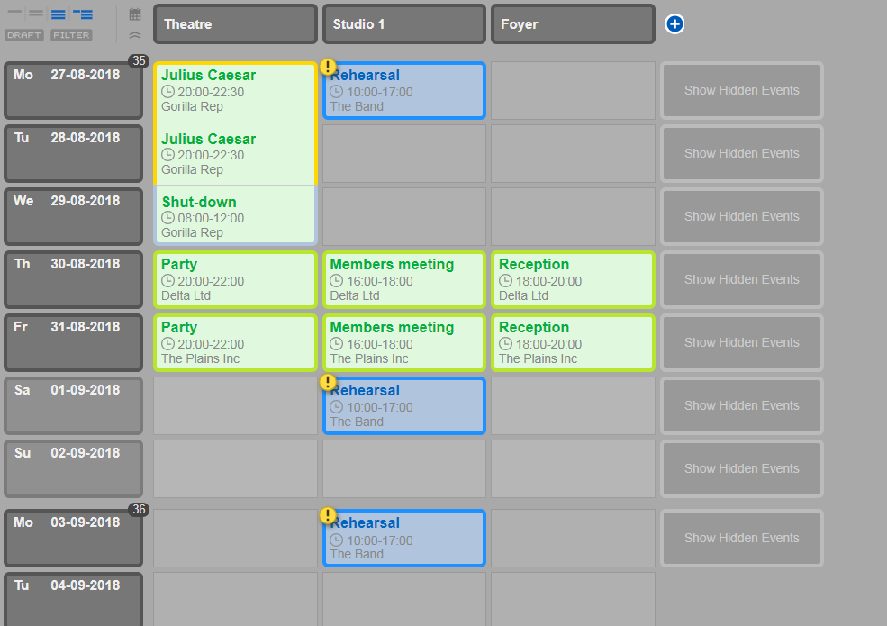 Yesplan doesn’t prevent you from overbooking a location, and you can assign more than the available resources to an event. However, Yesplan will mention this via an event conflict. An event with a conflict is an event of which the planning probably isn’t correct, according to the information that Yesplan has. A conflict also mentions the required information why there is a planning problem.