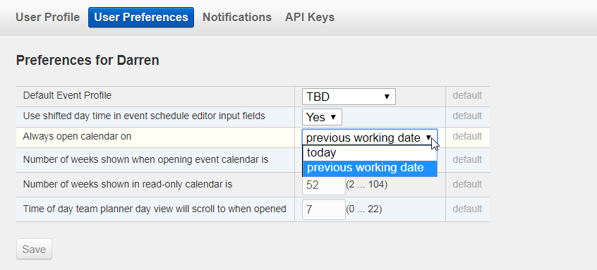You can find this setting to open the event calendar on the working date under “User Settings”, in the “User Preferences” tab. Under the setting “Always open calendar on” select the option “previous working date” from the drop-down menu. Next, click “Save” below the list to save the changes.