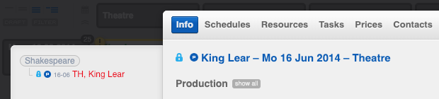 Events that have one or more resource bookings with actual times appear with a blue padlock. You’ll find the padlocks in the same places as the gray padlocks for events with a status of type “Locked”, but you can’t unlock these padlocks: the actual times must be deleted first.