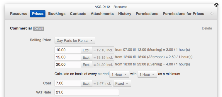 - The resource ‘Microphone’ has a price definition ‘Commercial Hire’ with a VAT rate of 21 %.