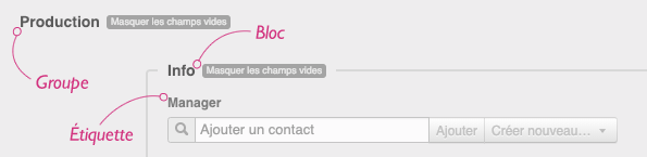 • Blocs : Au sein d’un groupe, les champs de données personnalisées peuvent à leur tour être répartis en blocs :