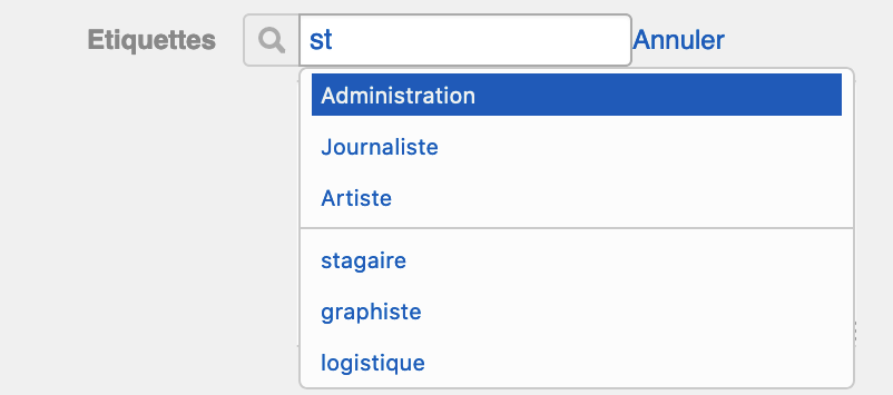 L’exemple ci-dessus concerne l’ajout d’une étiquette à un contact. L’utilisateur a introduit les lettres « st » :