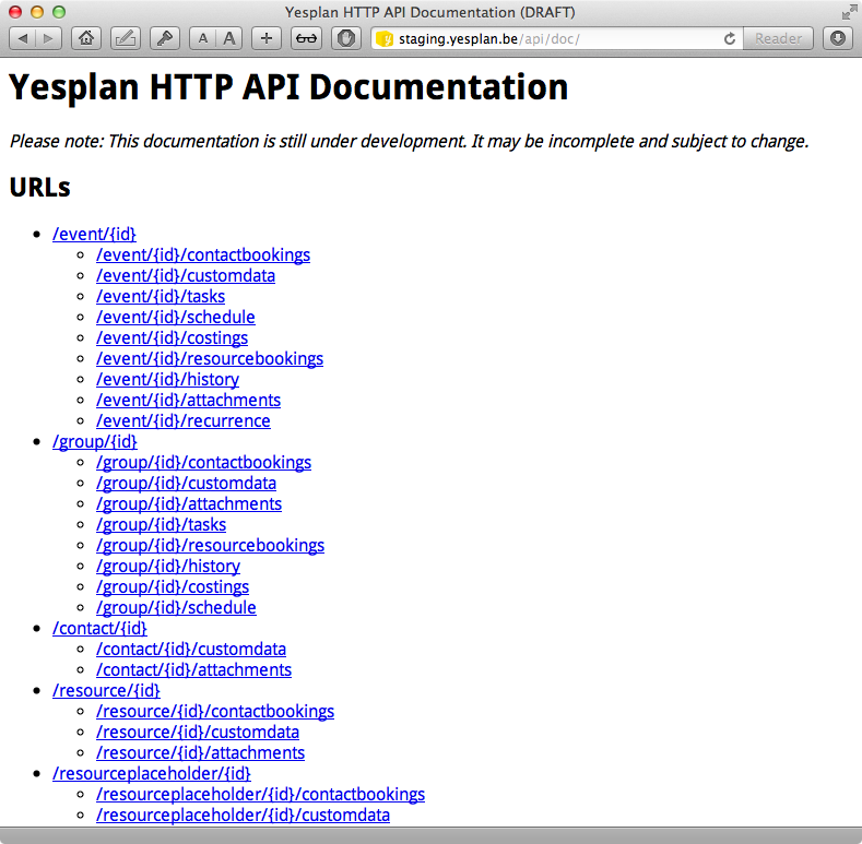 Yesplan provides customers and third-party developers with an API to access its event planning data. Read the contents of this page carefully, including the Restrictions and Responsibilities described at the bottom, to understand how to be a good API citizen and to understand general restrictions and concerns. The API is based on HTTP and follows certain, but not all, REST principles. This document assumes you are familiar with the HTTP protocol as documented in RFC 2616, it does not assume familiarity with REST.
