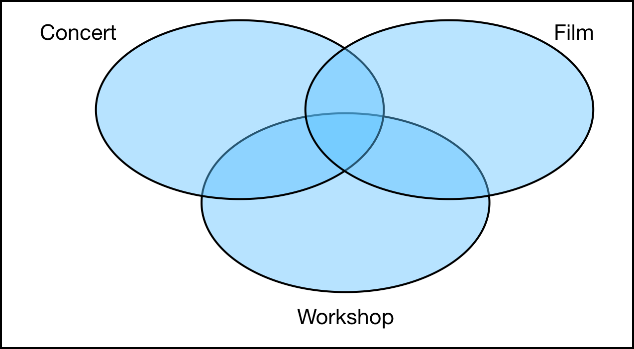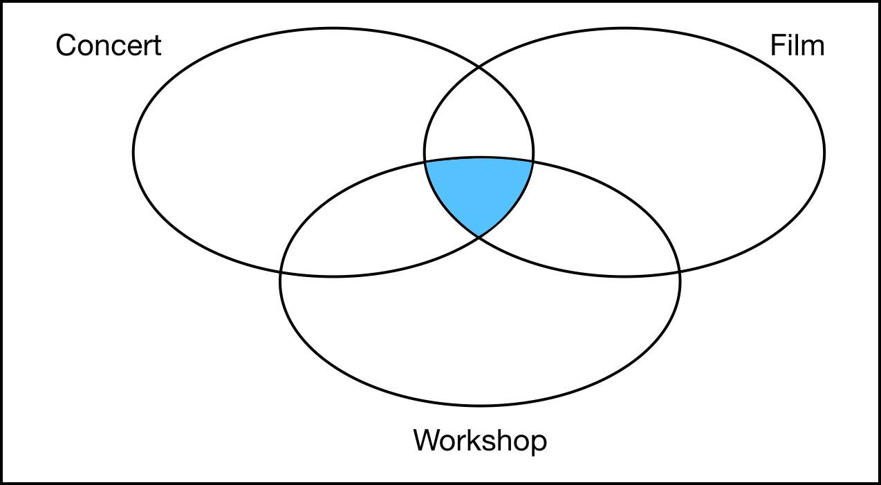 Vous pourriez, par exemple, filtrer par l’étiquette d’un événement : concert, film ou atelier. Si vous combinez ces filtres avec AND, Yesplan analyse pour chaque événement s’il contient les trois étiquettes. En résumé, vous recherchez l’intersection des trois ensembles, avec pour résultat une liste d’événements reprenant aussi bien des concerts et des représentations cinématographiques que des ateliers.