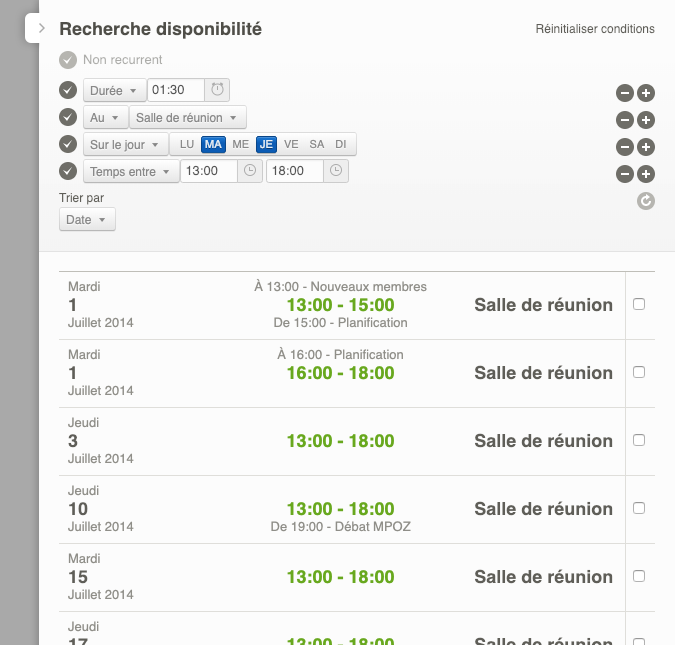 La liste des disponibilités est affichée sous la requête. L’exemple montre une première disponibilité le mardi 1er juillet de 13 à 15 heures. La deuxième disponibilité de la liste indique que vous pouvez également programmer l’événement entre 16 et 18 heures. Ces deux possibilités montrent aussi que la Salle de réunion n’est en revanche pas libre de 15 à 16 heures, un événement « Planification » y étant déjà prévu. La troisième disponibilité de la liste indique que la Salle de réunion est entièrement libre le jeudi suivant de 13 à 18 heures et la quatrième, qu’il est également possible de programmer l’événement le jeudi 10 juillet entre 13 et 18 heures, et ainsi de suite.
