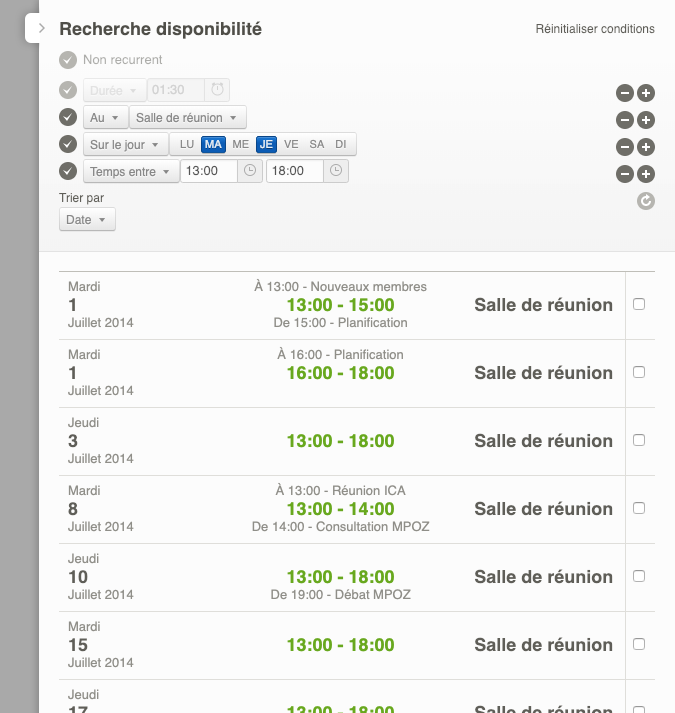 À titre d’exemple, nous cherchons une plage disponible pour un événement d’une heure et demie dans la Salle de réunion, un mardi ou un jeudi, dans l’après-midi. Le menu déroulant « Sélectionner une condition » vous permet de construire la requête. Le bouton « + » et le bouton « – » permettent d’ajouter ou de supprimer des conditions de recherche. L’image ci-dessous montre des conditions relatives à la durée (1 heure et 30 minutes), au lieu qui doit être libre (Salle de réunion), au jour prévu pour l’événement (mardi ou jeudi) et à la tranche horaire souhaitée (l’après-midi, entre 13 et 18 heures) (voir figure 1).
