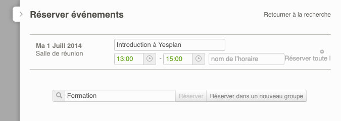 Les événements sont toujours réservés dans un groupe d’événements. Le nom de ce groupe est indiqué en bas de la liste. Vous pouvez ajouter l’événement à un nouveau groupe d’événements en cliquant sur « Réserver dans un nouveau groupe ». S’il existe déjà un groupe avec un nom correspondant, vous pouvez aussi ajouter l’événement à ce groupe d’événements existant en cliquant sur « Réserver ».
