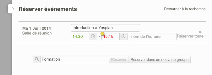 Pendant cette deuxième étape, celle de la réservation, vous verrez s’afficher des avertissements si vous introduisez des horaires qui dépassent la disponibilité. Dans la figure 5, une heure plus tardive a été introduite, qui ferait durer l’événement de 14 h 30 à 15 h 15. L’heure de fin est ici marquée d’un point d’exclamation, ce qui indique un conflit. En effet, l’heure de fin tombe après 15 heures, soit après l’heure de début de l’événement « Planification » qui a lieu dans la Salle de réunion à ce moment-là.