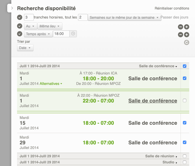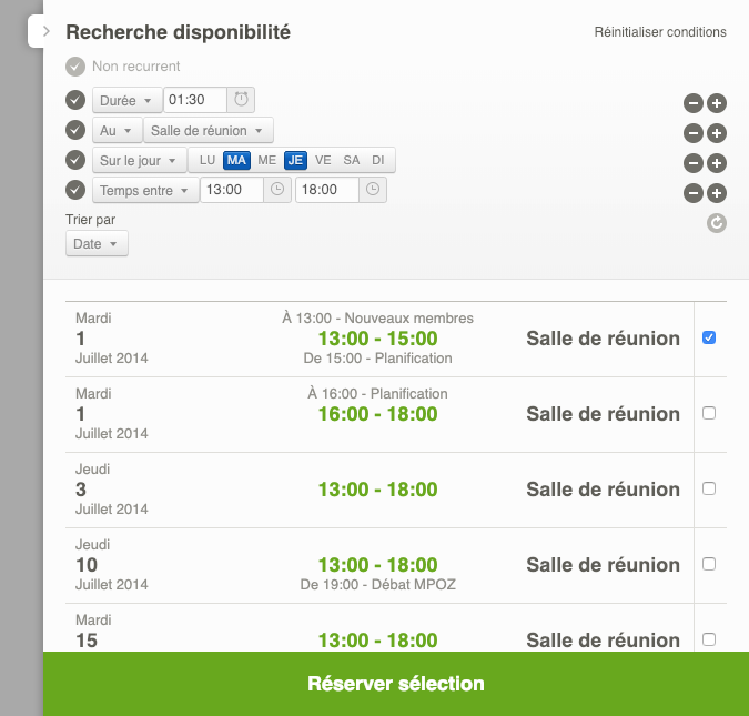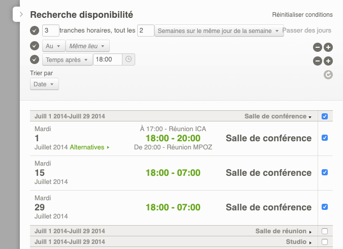 L’affichage des disponibilités est légèrement différent de celui des résultats d’une recherche non récurrente. Les plages éventuellement disponibles pour toute la série sont en effet réunies dans des groupes séparés par une barre grise. Chaque groupe répond à la requête spécifiée et pourrait donc être réservé en tant que série.