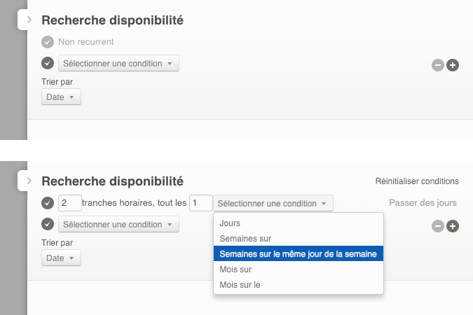 Par défaut, Yesplan cherche des plages disponibles pour un seul événement. Vous pouvez cependant aussi chercher des plages disponibles pour une série d’événements récurrents, par exemple un cours du soir en trois séances toutes les deux semaines. À cet effet, vous pouvez compléter la requête en ajoutant le nombre d’événements à programmer, ainsi que la périodicité de ces événements. Pour ce faire, cliquez sur la case à cocher à gauche du texte « Non récurrent ».