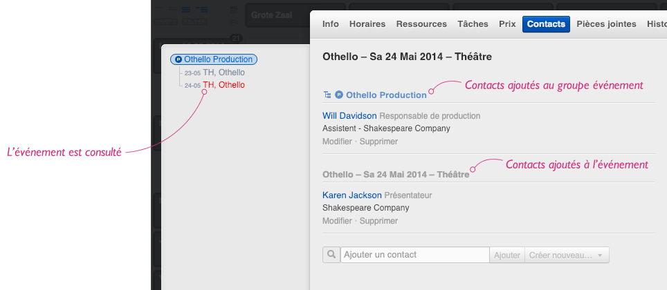 Nous vous proposons ci-dessous l’exemple d’un groupe d’événements « Shakespeare » dans le calendrier, avec deux productions, « Hamlet » et « Othello », chacune avec trois représentations.