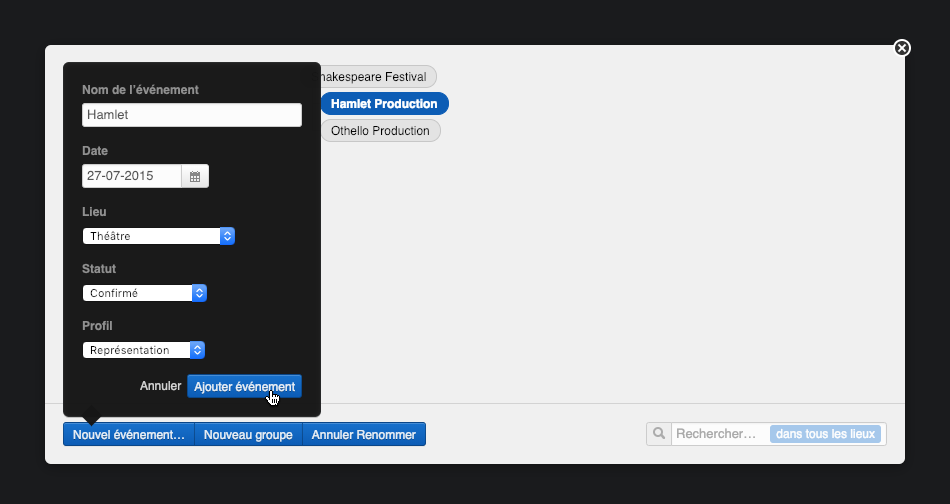 Commençons par les représentations de « Hamlet ». Pour ce faire, commencez par sélectionner l’élément auquel vous voulez ajouter les événements, le groupe « Hamlet Production » (en cliquant sur l’élément). Cliquez à présent sur le bouton « Nouvel événement… » dans le coin inférieur gauche de la fenêtre de l’affichage en arbre. Dans la fenêtre de détail qui s’ouvre, nous complétons le nom (« Hamlet ») et choisissons la date, le lieu, le statut et le profil adéquats. Une fois tous les champs correctement remplis, nous cliquons sur le bouton « Ajouter événement ». L’événement apparaît dans le groupe « Hamlet Production ». Nous répétons ces étapes pour la deuxième représentation de « Hamlet ».