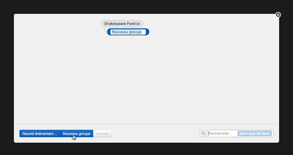 Cliquez sur le bouton « Nouveau groupe » dans le coin inférieur gauche de la fenêtre de l’affichage en arbre. Modifiez le nom en « Shakespeare Festival » et appuyez sur Enter. Assurez-vous que le groupe est encore sélectionné (il s’affiche en bleu) et cliquez ensuite à nouveau sur le bouton « Nouveau groupe » dans le coin inférieur gauche. Le nouveau groupe fait désormais partie de « Shakespeare Festival » (l’élément sélectionné). Nommez correctement ce groupe, « Hamlet Production », et appuyez sur Enter.
