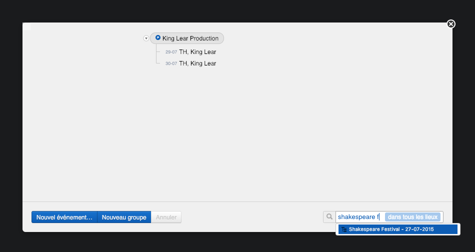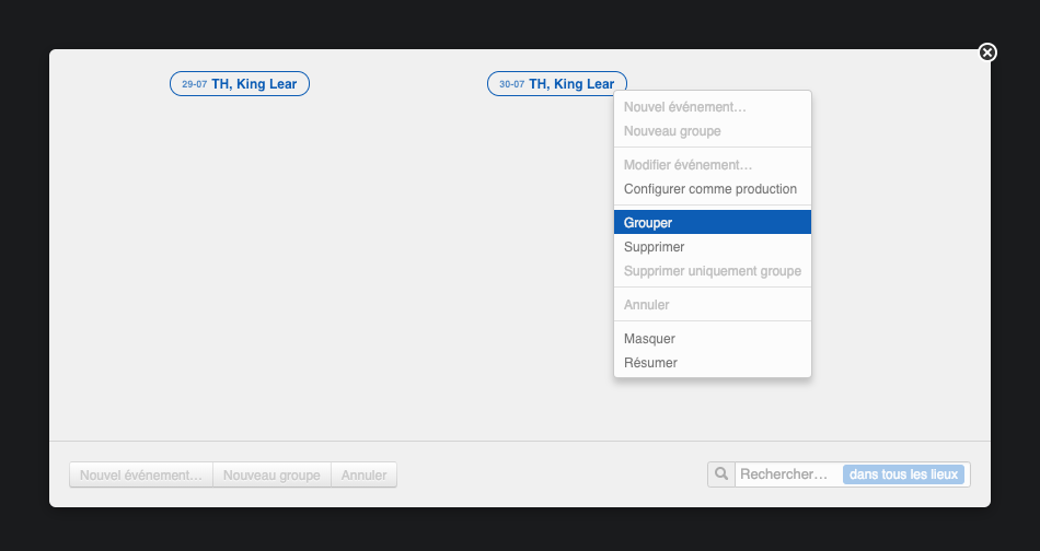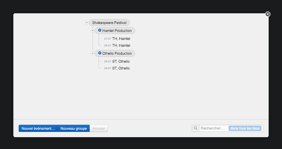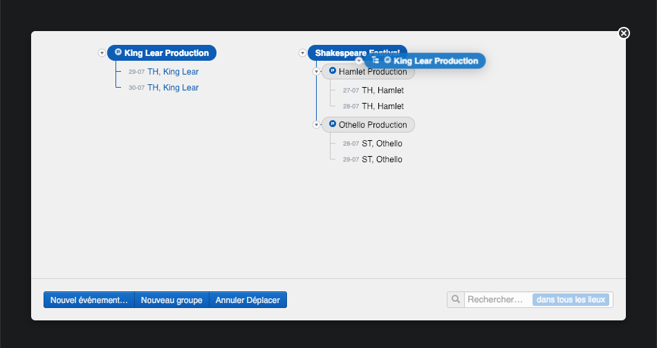 Allez dans le calendrier des événements et créez deux représentations portant le nom « King Lear », par exemple pendant deux jours successifs et dans le même lieu. Nous allons maintenant regrouper ces événements dans l’affichage en arbre et les ajouter au festival. Sélectionnez les deux nouvelles représentations dans le calendrier (cliquez d’abord sur le premier « King Lear », puis sur l’autre en maintenant enfoncée la touche Ctrl (sous Windows) ou Cmd (sous macOS)), et cliquez sur l’icône « arborescence » pour ouvrir l’affichage en arbre.