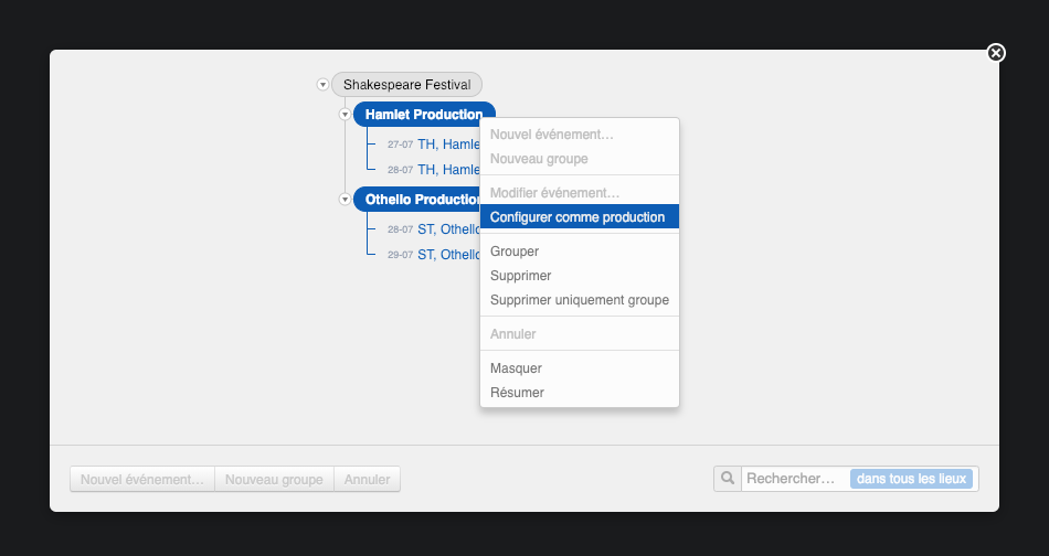 Commencez par sélectionner « Hamlet Production » en cliquant sur le groupe, puis « Othello Production » en cliquant en maintenant enfoncée la touche Ctrl (sous Windows) ou Cmd (sous macOS). Ouvrez maintenant le menu contextuel d’un clic droit sur l’un des éléments sélectionnés (« Hamlet Production » ou « Othello Production ») et choisissez la commande « Configurer comme production » dans le menu.