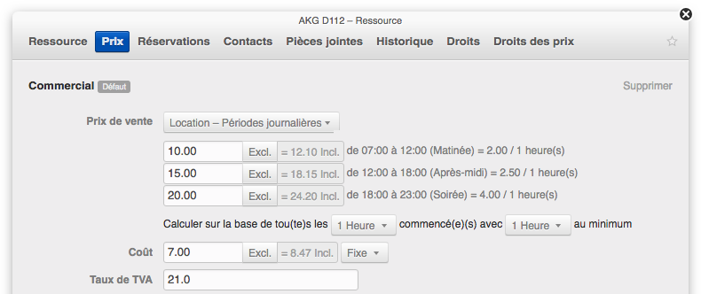 - La ressource « Micro » a une définition de prix « Location commerciale », avec un taux de TVA de 21 %.