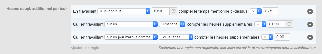 Si plusieurs règles s’appliquent à une journée donnée, le compteur des heures supplémentaires utilisera la règle qui rapporte le plus grand nombre d’heures supplémentaires au collaborateur. Par exemple, dans le cas des règles ci-dessus, le travail presté un dimanche qui est en même temps un jour férié entraînera le doublement de toutes les heures de travail pendant cette journée.