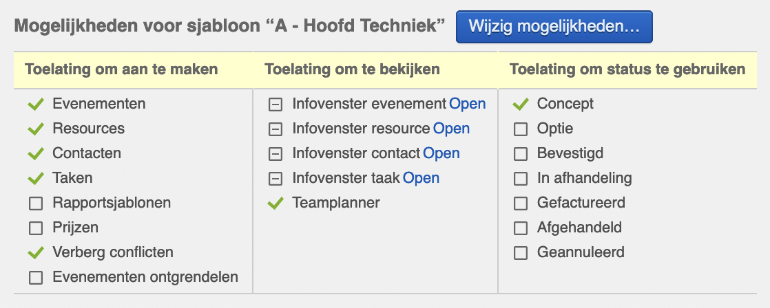 Onder “Rechten voor sjabloon” vind je de rechten die volgens dat sjabloon aan andere gebruikers(groepen) uitgedeeld worden.