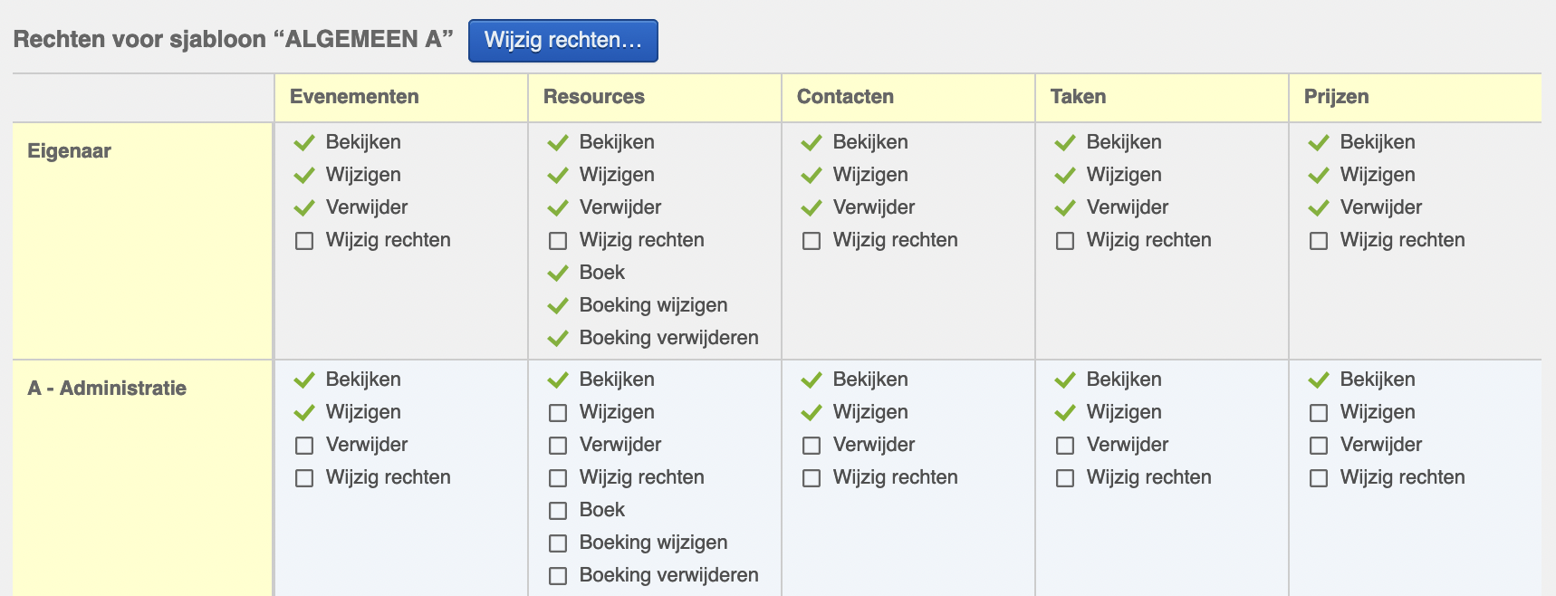 • In het sjabloon ‘Algemeen’ voegen we een rij toe voor “Eigenaar”, waarbij die rechten krijgt om evenementen te bekijken, wijzigen en verwijderen. Bij “Alle anderen” zijn deze rechten niet geselecteerd.