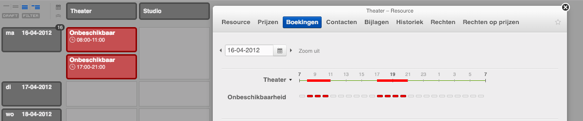 Het is mogelijk om via de evenementenkalender, de Teamplanner of het infovenster van de resource aan te geven dat een resource of locatie gedurende bepaalde periodes onbeschikbaar is. Onbeschikbaarheden hebben in Yesplan geen afzonderlijke rechten, maar volgen de rechten van die resource. Dus, als een gebruiker een bepaalde resource mag boeken, kan deze gebruiker de resource ook als onbeschikbaar aanduiden en onbeschikbaarheden verwijderen.