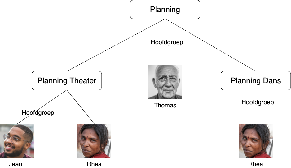 • Thomas heeft als hoofdgroep de bovenliggende groep ‘Planning’, die zowel ‘Planning Theater’ als ‘Planning Dans’ bevat.
