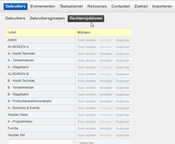 • Onder de lijst van sjablonen zie je de mogelijkheden en de uitgedeelde rechten van de gebruiker.