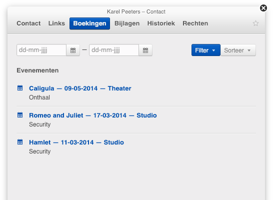 Je kan contacten boeken op evenementen, bijvoorbeeld als contactpersoon of als coördinator van een voorstelling. Je kan contacten ook boeken op resources en contacten.