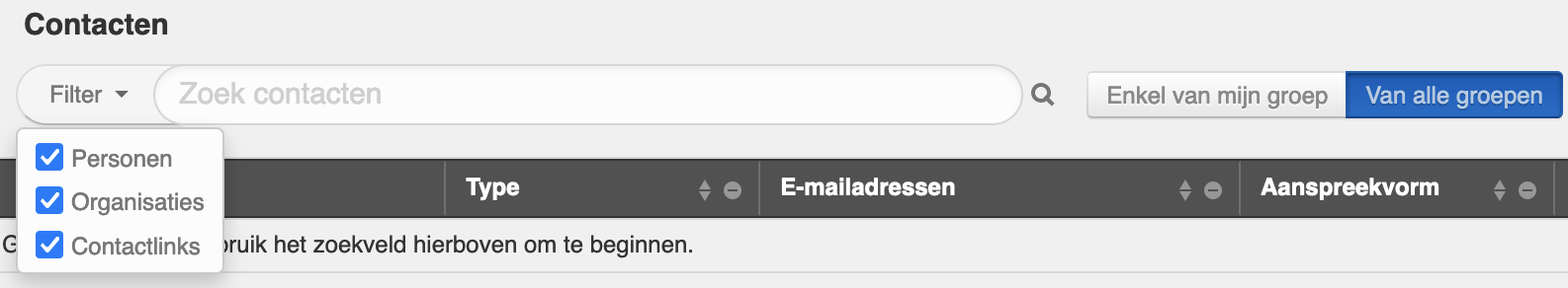 - De filter voor het type contact is handig als je enkel bepaalde types contacten wilt zien in je zoekresultaten, bijvoorbeeld enkel organisaties en links. Je stelt deze filter in via het keuzemenu aan de linkerkant van het zoekveld. Door een type te selecteren of te deselecteren zal dit type wel of niet verschijnen in de zoekresultaten.
