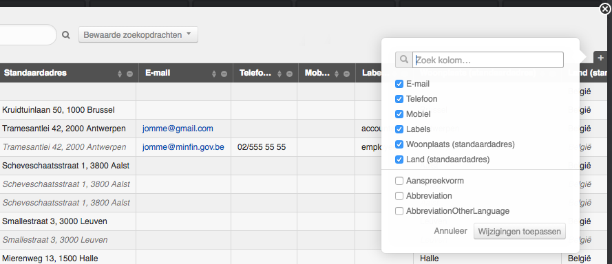Bovenaan het zoekvenster kan je een zoekopdracht invoeren en filters instellen. De gevonden contacten verschijnen in een tabel, waarbij je kan kiezen welke eigenschappen van de contacten te zien zijn door kolommen toe te voegen of te verwijderen.