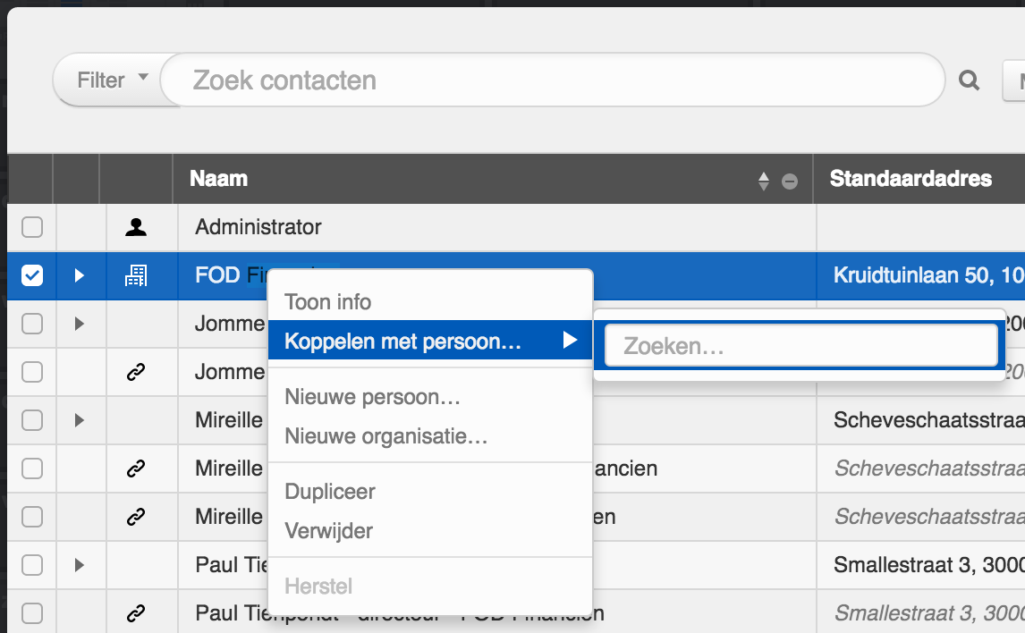 Koppel een contact aan een ander contact via de actie “Koppelen met persoon…” of “Koppelen met organisatie…”, naargelang je een persoon of organisatie hebt geselecteerd.