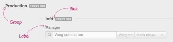 In onderstaand voorbeeld zie je een customdataveld met het label ‘Manager’, dat automatisch het keyword ‘production_info_manager’ krijgt.