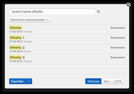 Het resultaat van deze zoekopdracht zal de evenementen ‘Othello’, ‘Othello 1’, ‘Othello 2’, ‘Othello 3’, alsook de evenementgroep ‘Othello productie’ tonen.