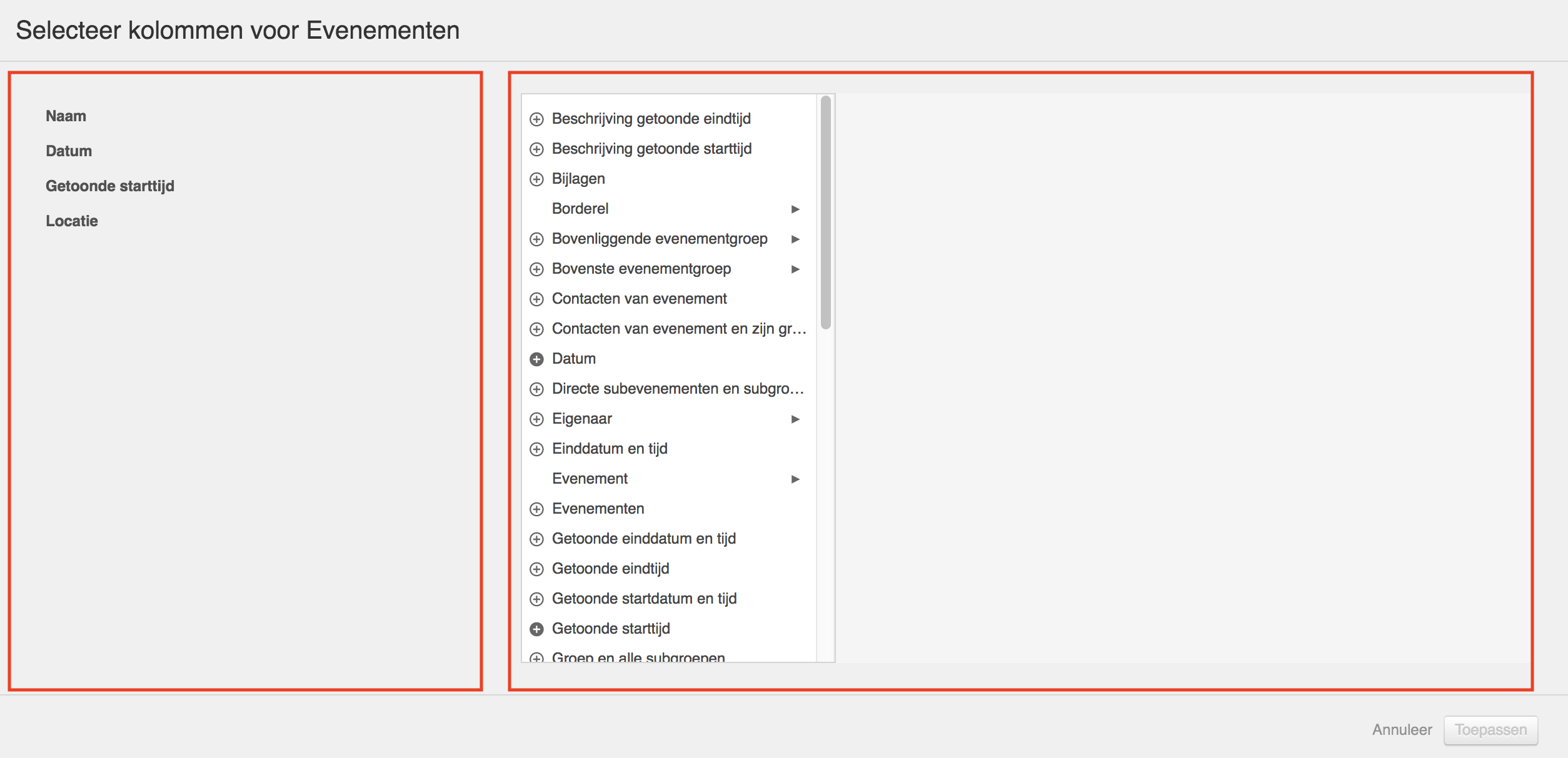 Het selectievenster bevat aan de linkerkant de lijst van velden die in de dataview reeds verschijnen als kolom. De lijst toont de naam van het veld en zijn plaats in de structuur van Yesplan. Bijvoorbeeld binnen de scope van evenementen: