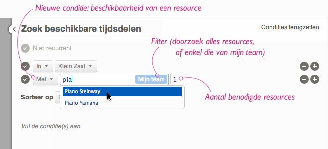 Bijvoorbeeld: zoeken naar beschikbare tijdsdelen in de Kleine Zaal waarbij er ook 1 Steinway piano beschikbaar is.