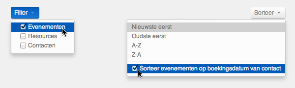 Je kan uiteraard nog steeds álle boekingen opvragen (door de filter aan te passen) of de boekingen op het evenement sorteren op de boekingsdatum van het contact (door “Sorteer evenementen op boekingsdatum van contact” te selecteren).